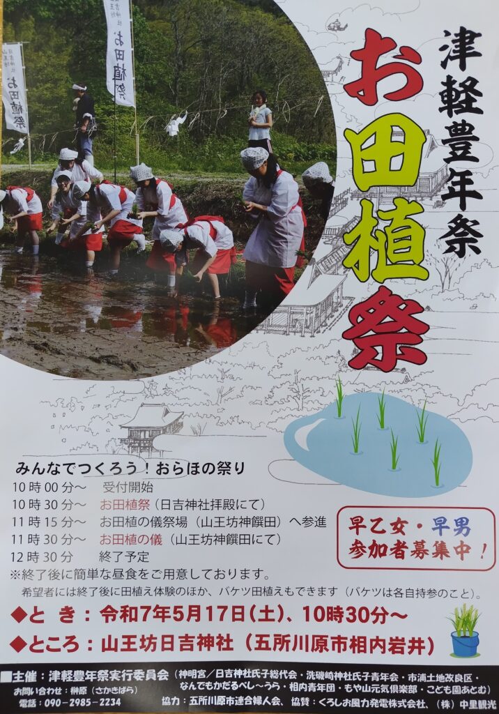 令和7年度 津軽豊年祭『お田植祭』開催について 五所川原市の相内地区で、五穀豊穣を祈願する「お田植祭」が開催されます日時:令和7年5月17日(土) 10時30分~場所:山王坊日吉神社(五所川原市相内岩井)早乙女・早男の参加者募集中! お問い合わせ ■津軽豊年祭実行委員会(榊原)/090-2985-2234